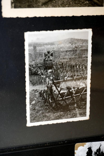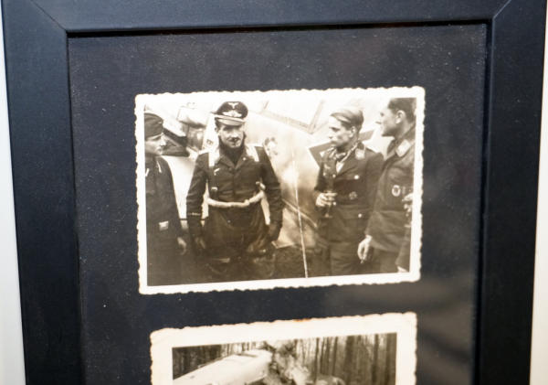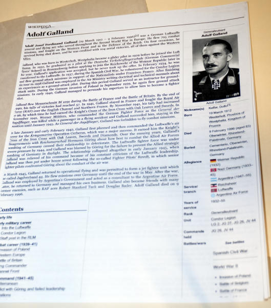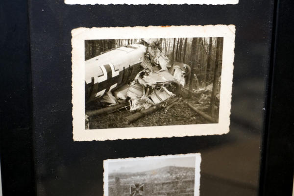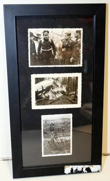 three smaller photos nicely framed; has sticker on bottom; has picture of Galland, one of a plane crash and one of his headstone; includes a folder w/history on Galland;