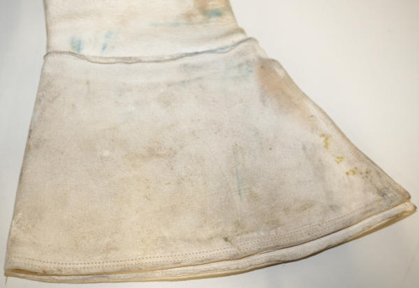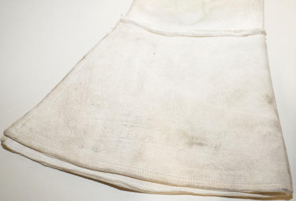 has markings on the cuffs but very hard to make out; very pliable nice leather; small size; gloves are about 13" long