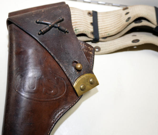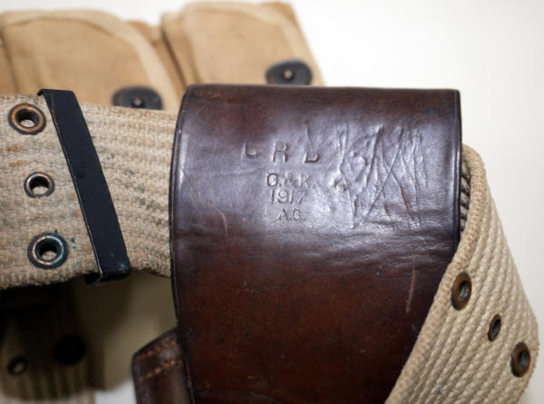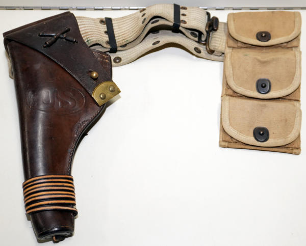 nice leather holster stamped 1917 G&K; white cotton web belt; ammo pouch has 18 rounds of 45ACP on half moon clips;
