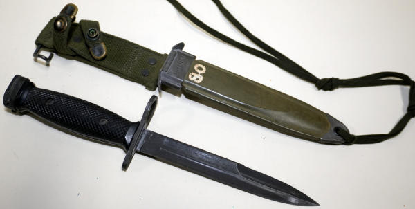 nice original; hard plastic scabbard w/green web strap; plastic checkered grips; blade is 6.5" long;