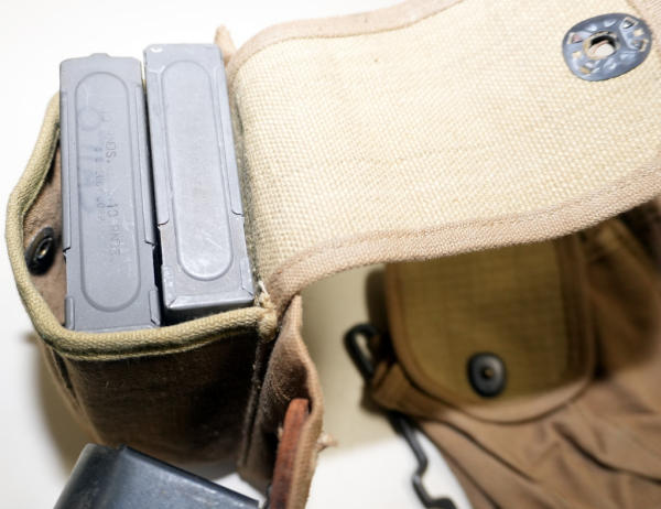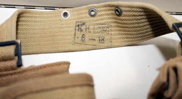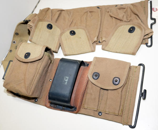 Long 6-1918 gunner's belt, with metal cup for the buttplate and 2 M1911 magazine pouches. Includes 2 Parkerized BAR magazines; nice original