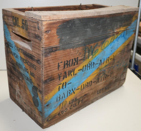 original; has some staining and paint; missing part of the lid; much larger than a normal ammo box; 18"x9.5"x13.5"