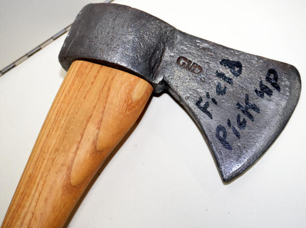 believe the marking is "GND", hard to read w/some pitting on axe head; new handle and cleaned metal; marked as a field pick up; overall 30" long