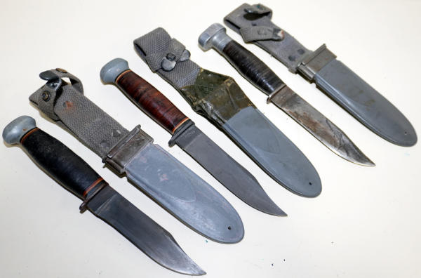 all have stacked leather handles; each shows some wear; tape on one sheath; one is Geneva & other two are RH Pal; sell 3x the money