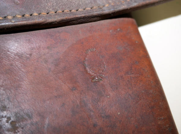 leather is stiff and needs cleaning; has maker mark but can't make it out; 34" long