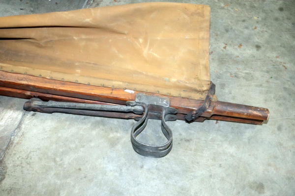 wood poles, light brown canvas, leather straps; metal feet; 7' long; NO SHIPPING, local pickup only