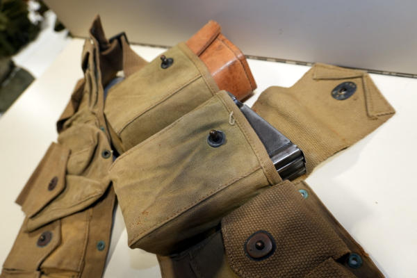 two 30-06 stripper clip pouches (with 4 stripper clips with brass). Includes 2 blued BAR magazines and 1 EK 1943 leather spare parts box in the pouches.