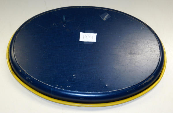 14.5" across, dated, colors are a little faded and light wear, but a very nice graphic Tray
