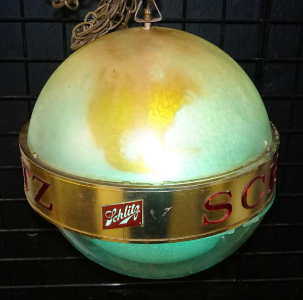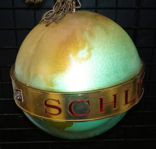 about 14" across, works, the top portion of the globe is discolored, bottom is good, I think from hanging in a smokey bar for years, needs a little TLC, but not bad and a good looking sign when lighted