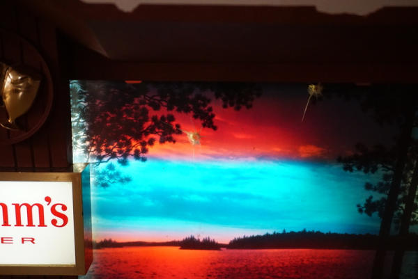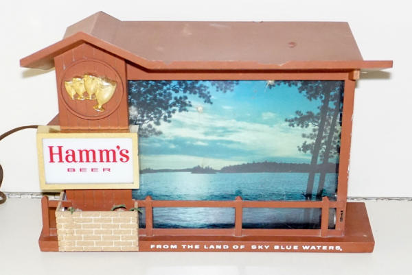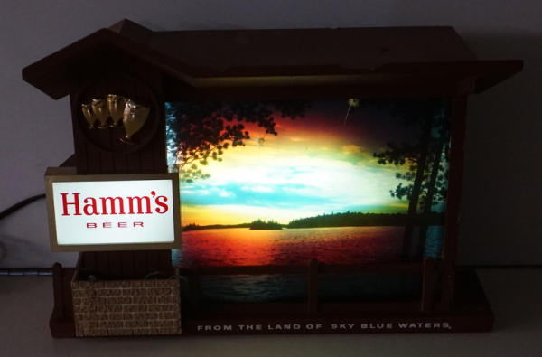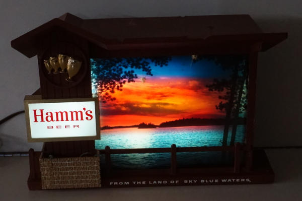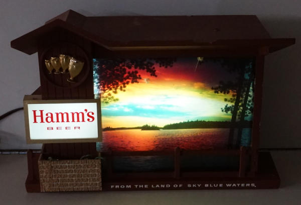 9.5" tall, 10" wide, background changes color to look like the sun is setting/rising, has some chips in the frame, harder to find Hamm's sign, most of the time we see this as the clock version