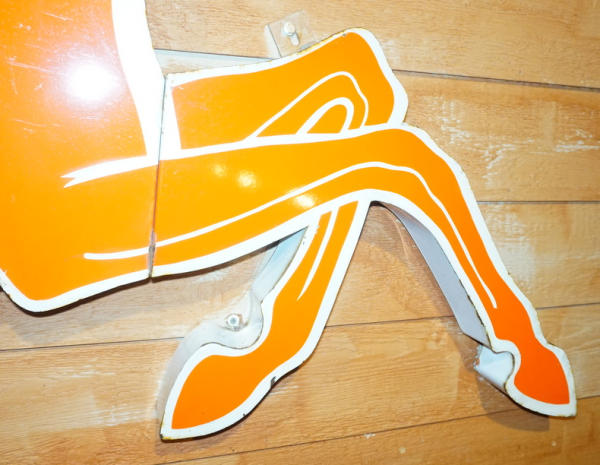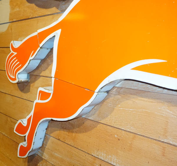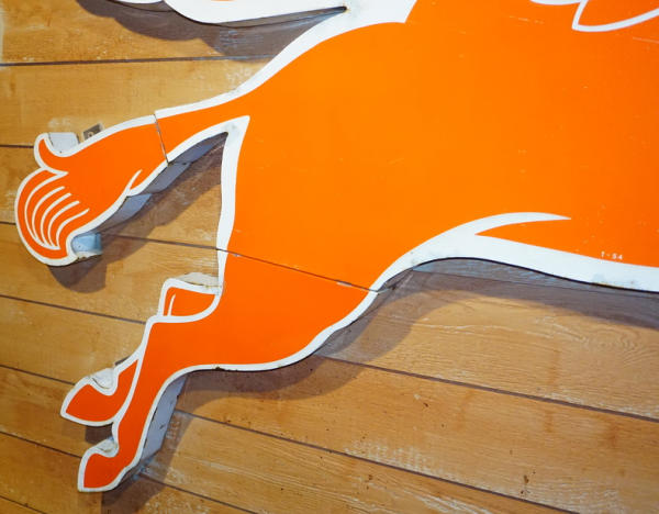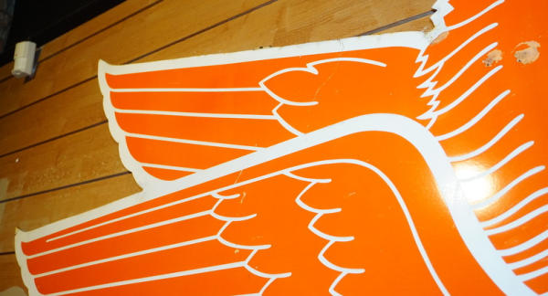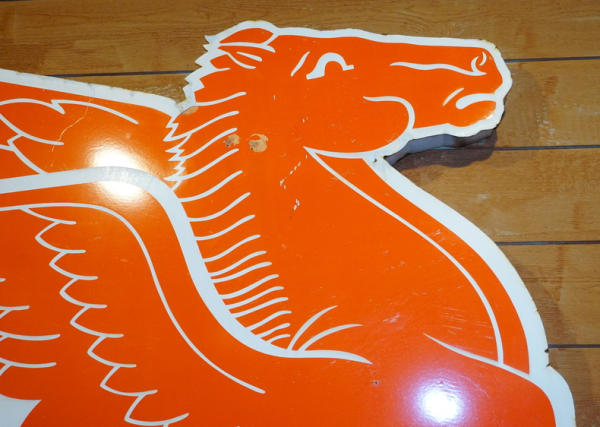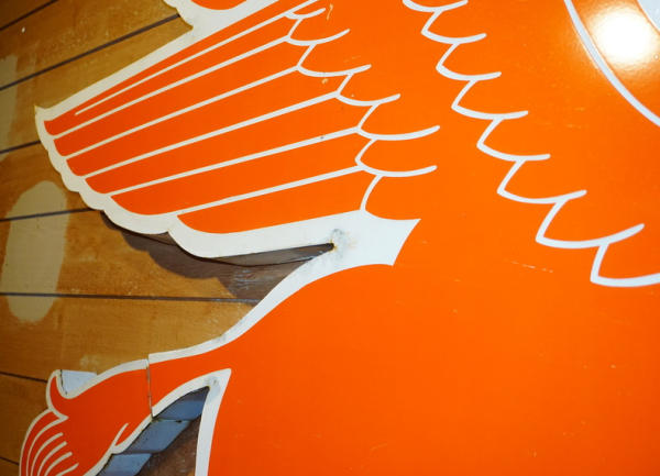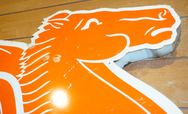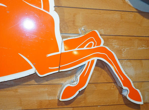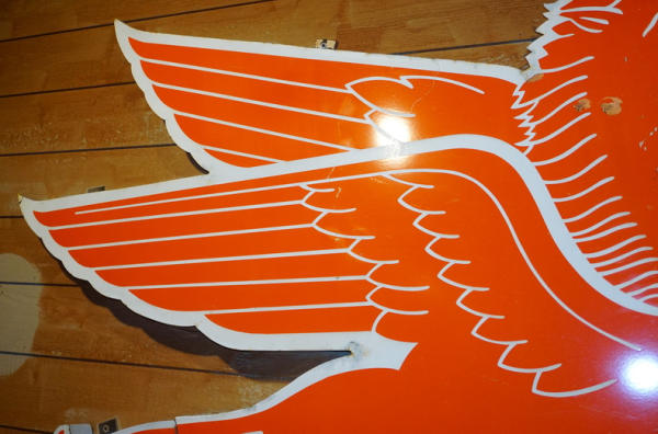 approx. 70"x96", dated T-54, this is the 4-piece right facing version, there are a few chips in the corners that have old touchups and a few small chips in the field, but overall is a strong 8 condition sign, this is the 4pc version, guaranteed old & original; No shipping, but can be picked up in Bismarck or we will bring back to Wakonda for pickup too