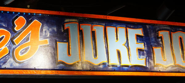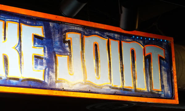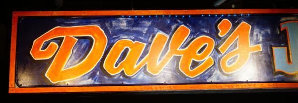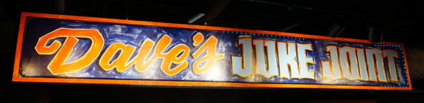 about 14' long, 2' tall, painted with some Christmas lights around the side that are not all working, Buyer responsible for removal, chained up behind the bar, going to need a ladder