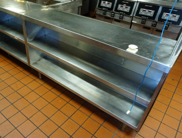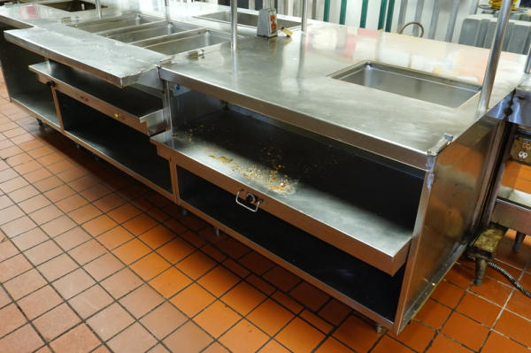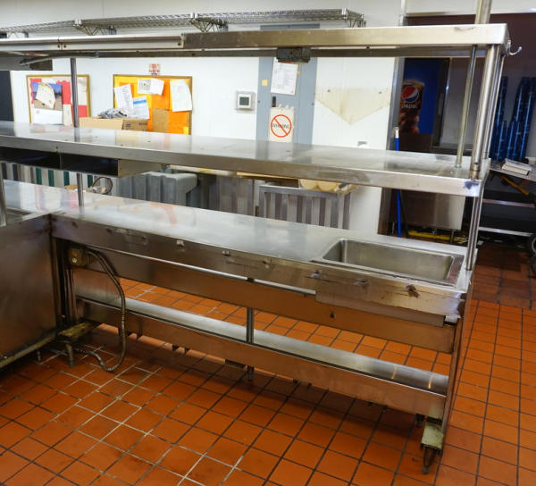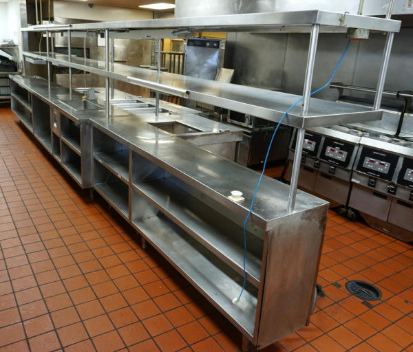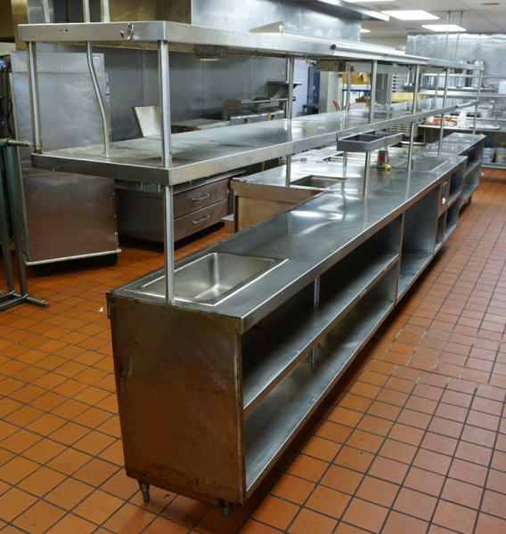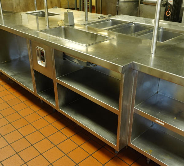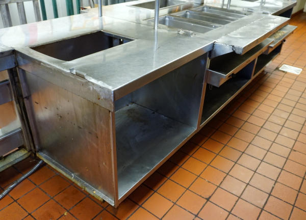 these sections are all welded together; so it sells are for one piece, buyer is responsible for dismantling and taking apart themselves; check photos to see all that is included; measures approx. 23' long x 58" wide (at the widest part) x 6' Tall; includes 3 Hatco Food Warmers; kitchen; ; Large Item Load Out