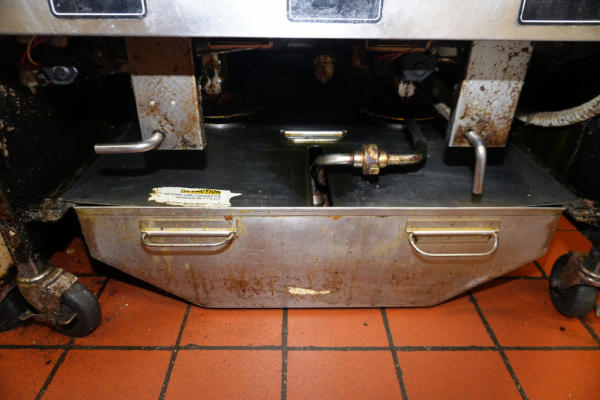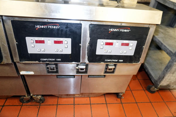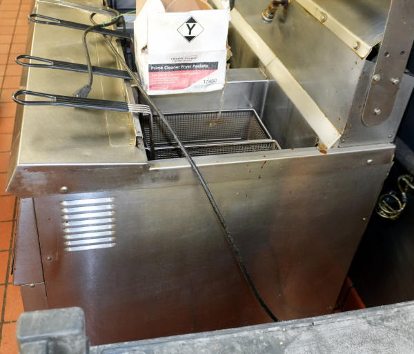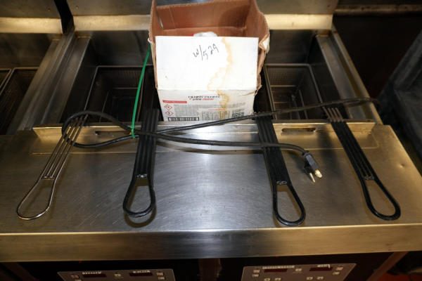 natural gas, 120amp; 33"Lx35"Lx53"T; has 4-baskets and a box of Cleaning Fryer Packets; on casters; kitchen