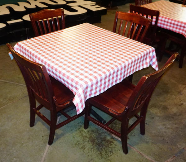 used; table clothes are glued on top; table top 3'x3'; middle dining room
