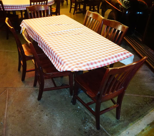 used; table cloth is glued on top; made up of 2 smaller tables put together; entire top is 5'x30"; middle dining room