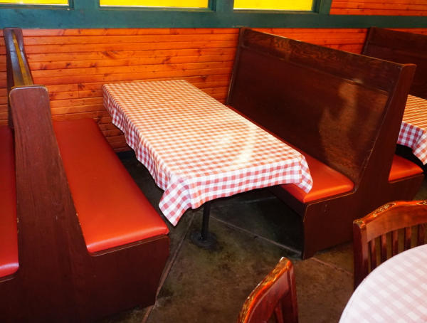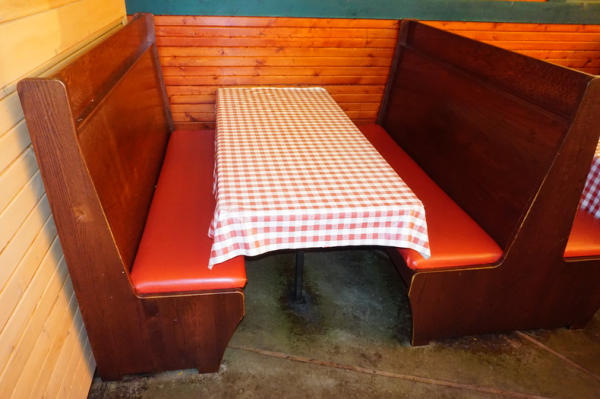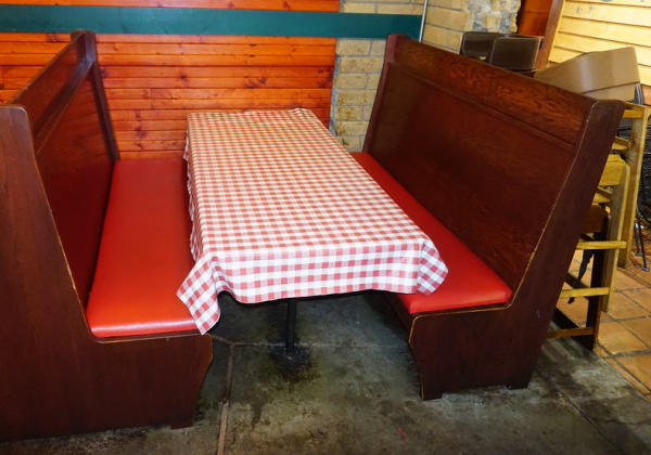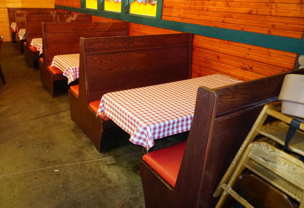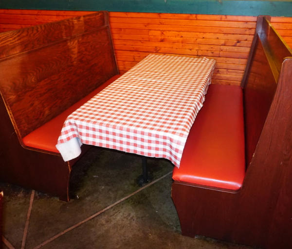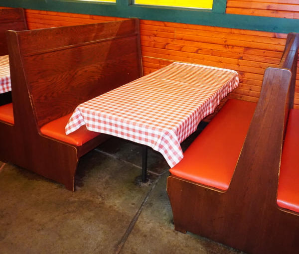 each table is 66"x30"; table clothes are glued to tops; all the seat pads look to be in good shape w/no tears; back rest are 4' tall; legs to tables have no feet, one leg is attached to floor & other end of table is attached to the wall; booths are loose; buyer responsible for taking tables off wall & floor; sell all for one shot; middle dining room; LARGE ITEM LOAD OUT