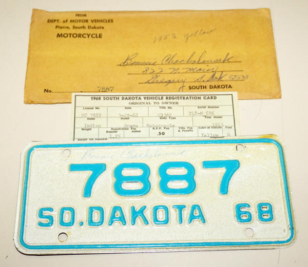 has "Bennie Chocholcuske" written on the front of the plate, but includes the original registration card for his '53 Indian Brave too! Neat piece of history, he was from Gregory, SD