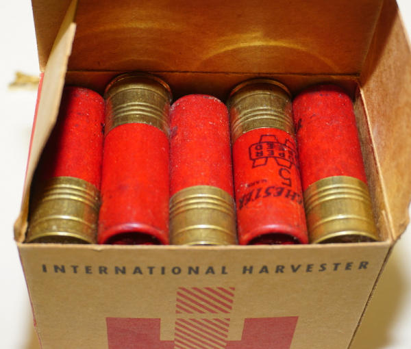 Clean and nice box, no markings at all, but full of 12ga Shotgun shells, comes with a nice shotgun tie bar too; Bill had a note with these that said it was from a IH Sponsored Trap Shooting event
