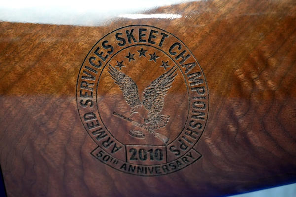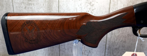 28" VR-BBL Contour Target; hy-gloss finish wood stock w/engraved logo in butt stock for "Armed Services Skeet Championships -2010 - 50th Anniversary"; Carlson's shell catcher; like new condition; factory box; gold trigger; 2.75"; includes Rem-Chokes; USA; SN#R298098V; A-252