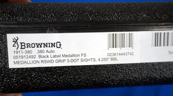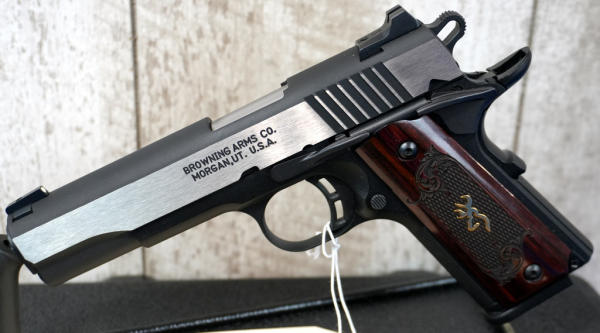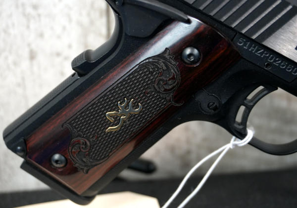 4.25" BBL; stainless slide; fancy checkered wood grips w/gold Browning logo; night sights; 2-magazines; factory hard case; looks fired but like new condition; USA; SN#51HZP02660; A-244