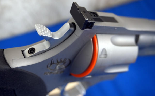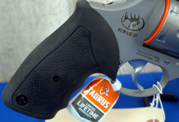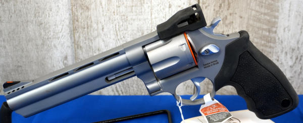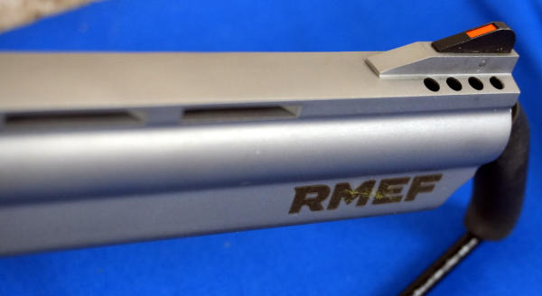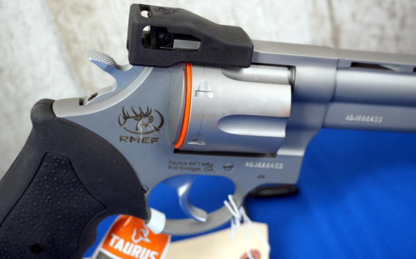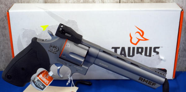 6.5" VR-Stainless Barrel; red ramp front sight w/adjustable read; finger groove rubber grips; 6-shot swing out cylinder; RMEF logo; factory box; looks mint & unfired; Brazil; SN#ADJ666455; A-244