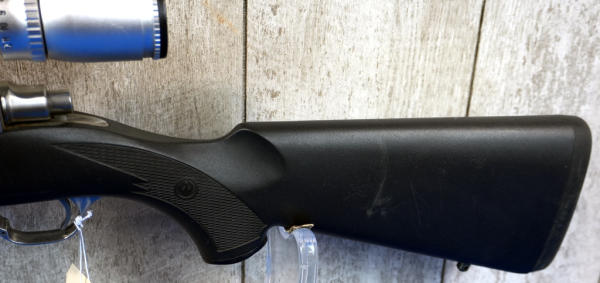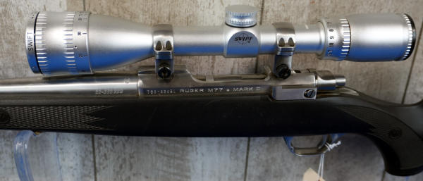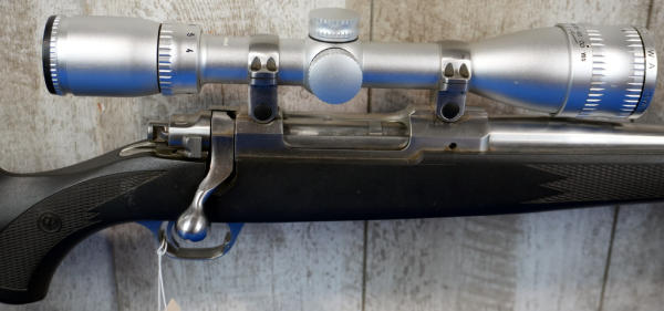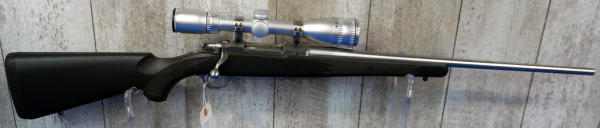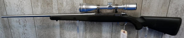 22" Stainless barrel; smooth action; black synthetic stock; stock & barrel has a few scratches from use & storage; Swift 4-12x40 scope; USA; SN#788-82491; A-245