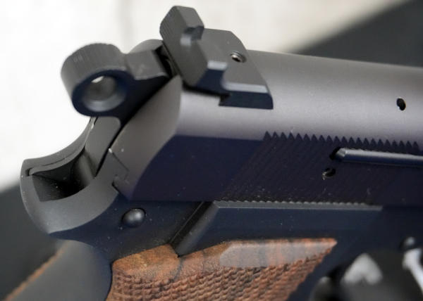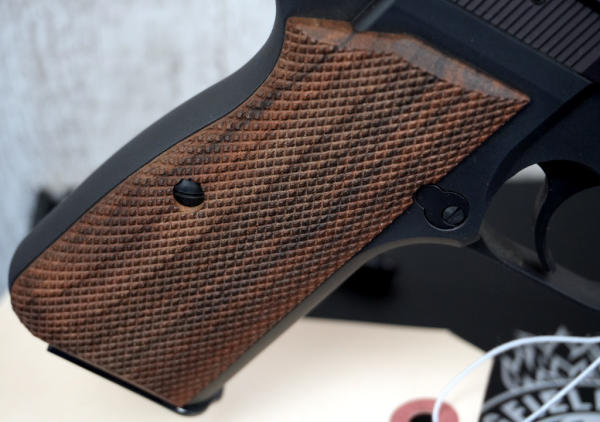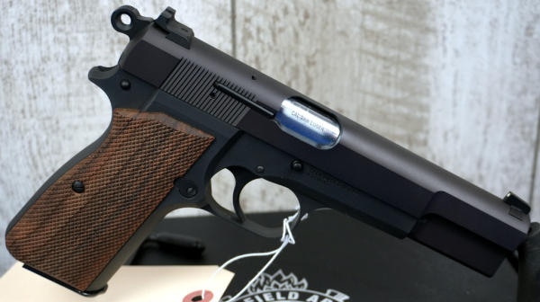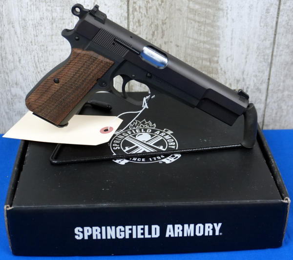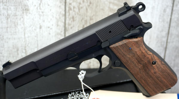 4.75" Stainless barrel; wood checkered grips; front night sight; mint & unfired; factory box w/soft zippered case; 2-magazines; USA; SN#HP3895; A-244