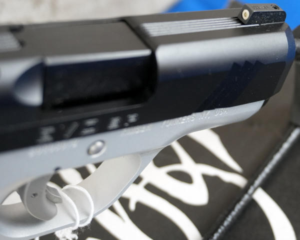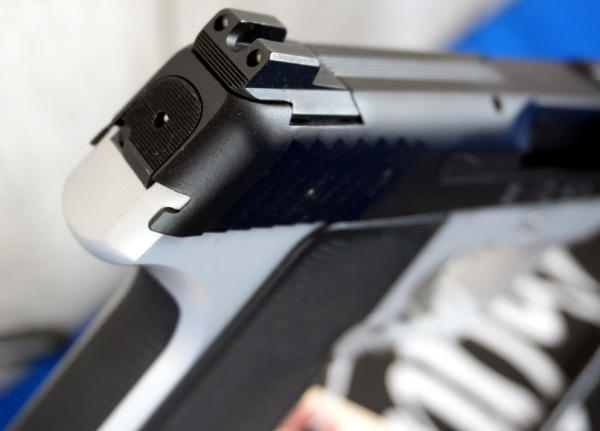 3.25" BBL; black checkered plastic grips; stainless body w/blued slide; night sights; factory box w/zippered soft case; 2-magazines; includes 2-sets of new grips and a backstrap; appears mint & unfired; USA; SN#B0003072; A-246