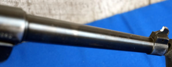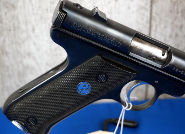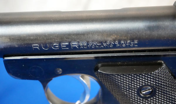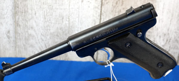 6" Tapered BBL; black checkered plastic grips w/silver eagle logo; bluing is dull in places; silver trigger and bottom of magazine; USA: SN#12-57241; A-263