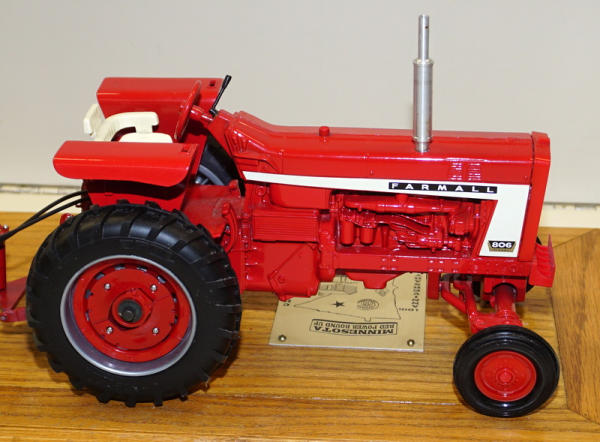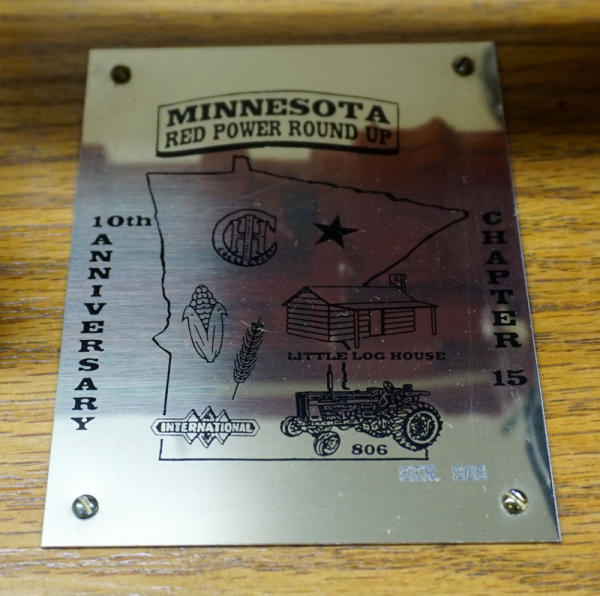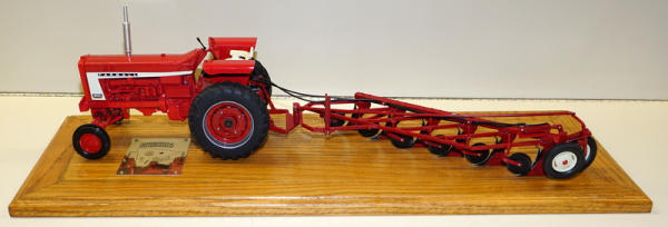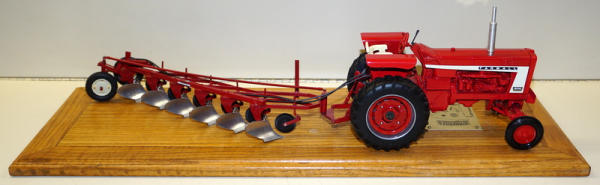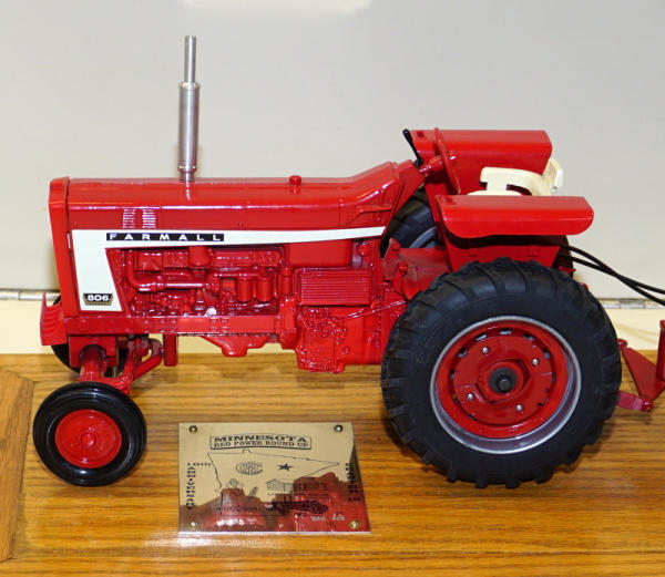 Ertl Tractor customized with 3pt hitch and wheel weights; plow is scratch built, really nicely done, I'm not sure by who, all mounted to a board with a "10th Anniv. MN Red Power Round-up" Brass plaque, SN#508; no shipping