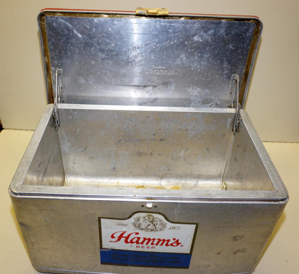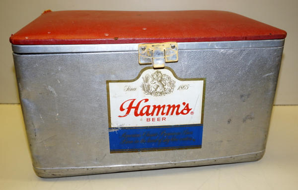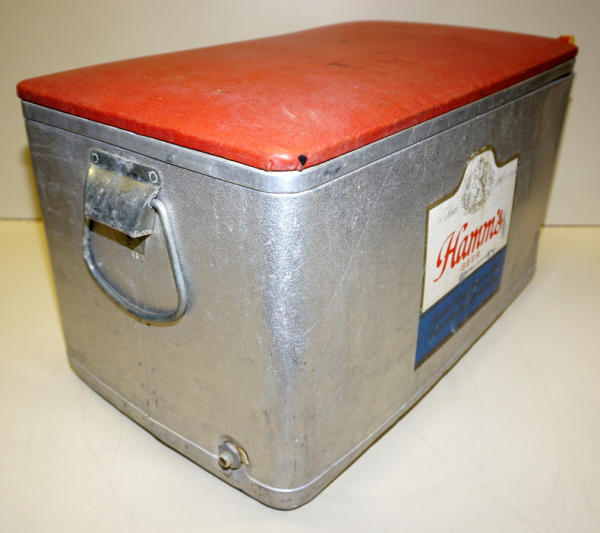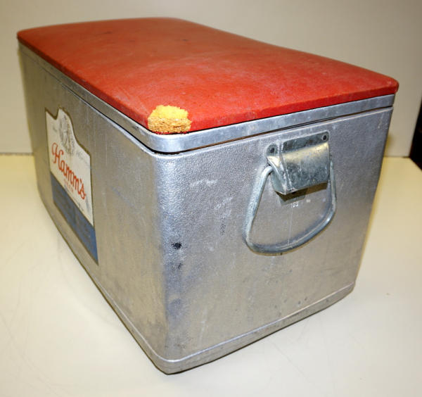 used original, 22" wide (smaller version of the padded top cooler), top is faded and one corner is damaged, cooler and some dings and patina