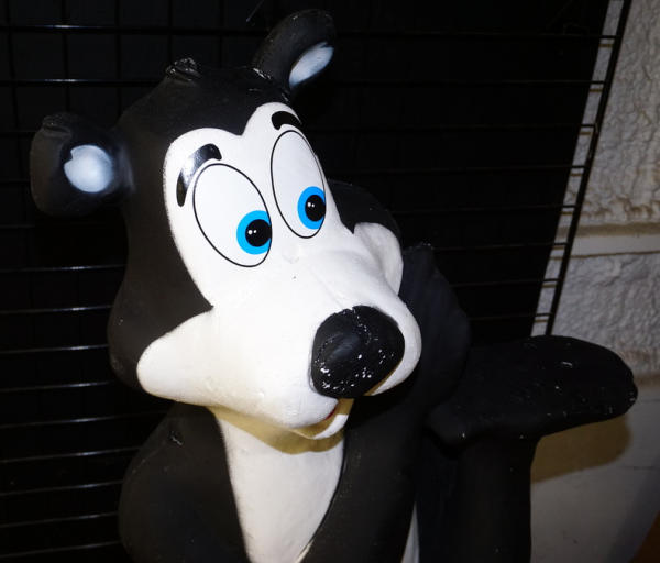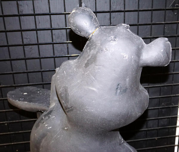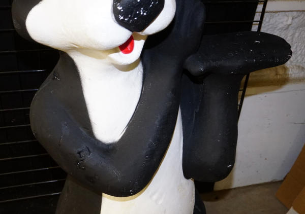 5' tall, one ear is broken off, but included, has some finger dents, scuffs, and some damage to the base, good color, not perfect, but not the worst one we have seen either