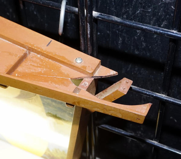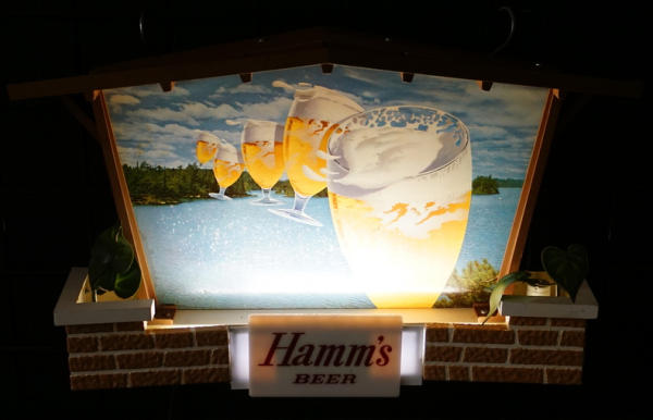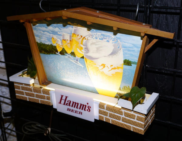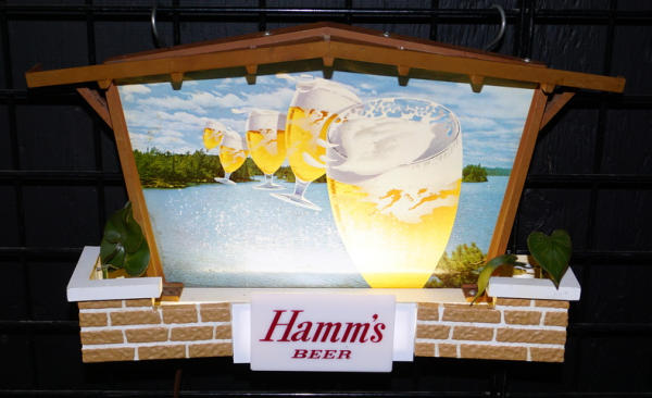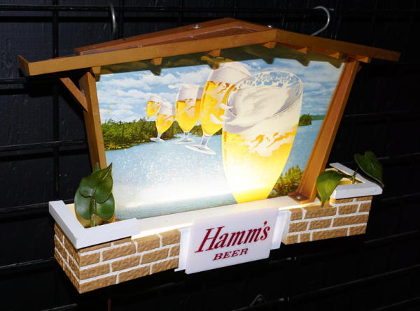 12" x20", has large spot of damage on the right side of the roof, nameplate is a replacement and needs the frame, colors are faded, going to need some TLC; background is pretty good however with good color