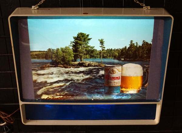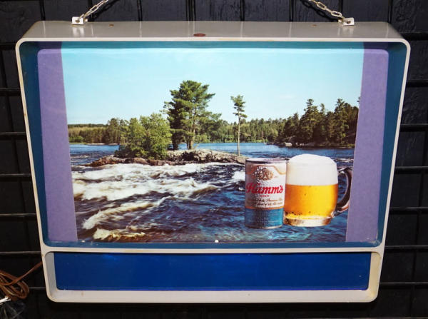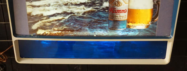 18"x22", lights up, no motion, not the correct scene or logo plate, to restore, case looks fine, discolored from age/smoke