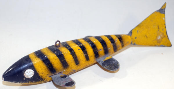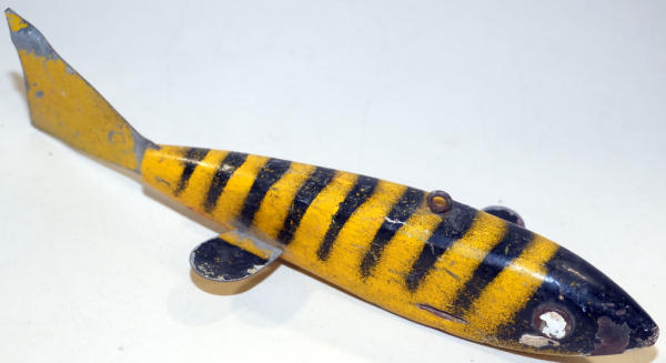 wood & metal; missing a fin and has some paint loss; old