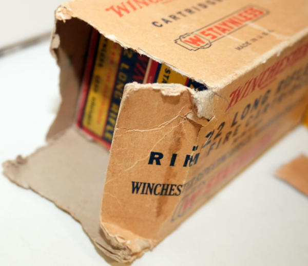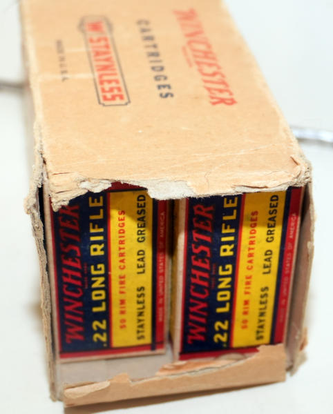 9 of the 50 round boxes are full, one is partial; most of the 50 rounds boxes are decent shape w/good color; outer brick box has wear and missing flaps; neat brick that's hard to find!