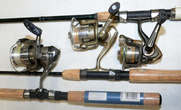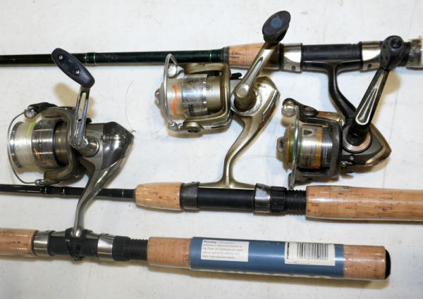 one rod tip is broken; reels look to be in good working order; need cleaning; sell for one money - NO SHIPPING