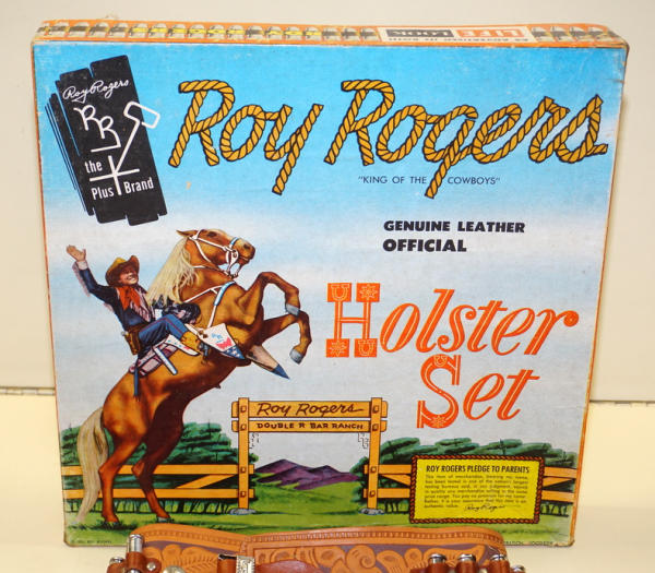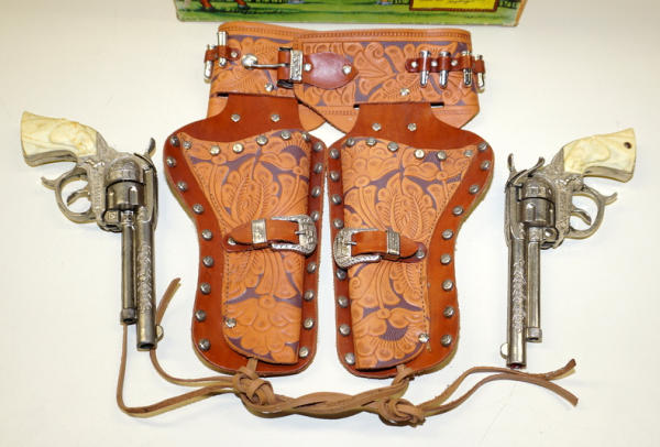 nearly a new old stock set of guns with nice real leather holster, guns both work, complete with bullets, great graphic box dated 1965, box has some general wear, but good color