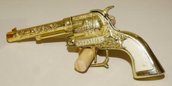 8" long, really clean gun with a gold finish, box is nice too, gun works