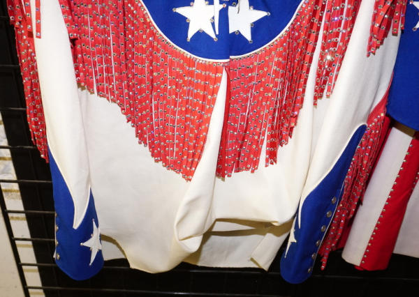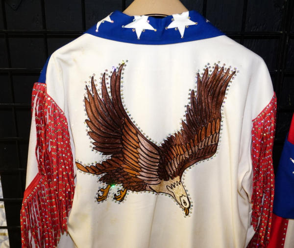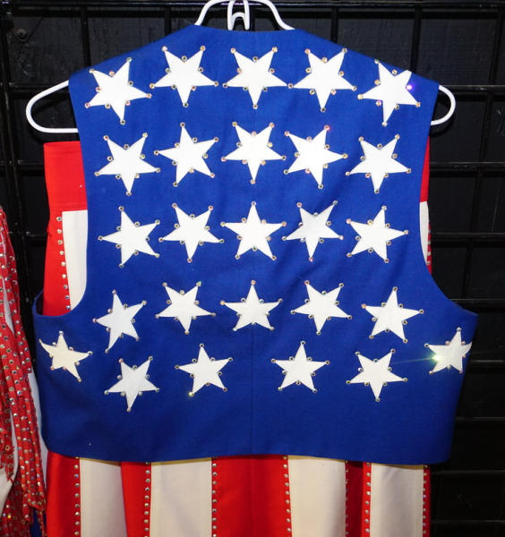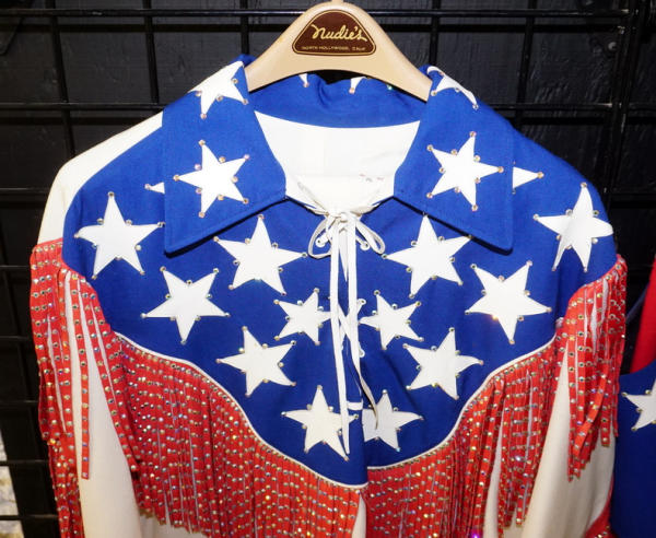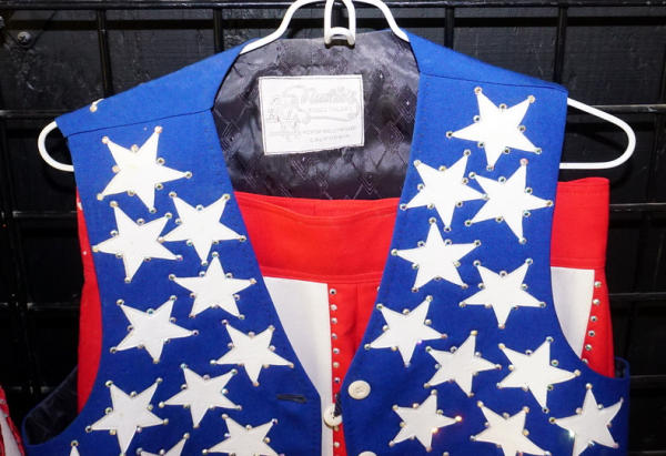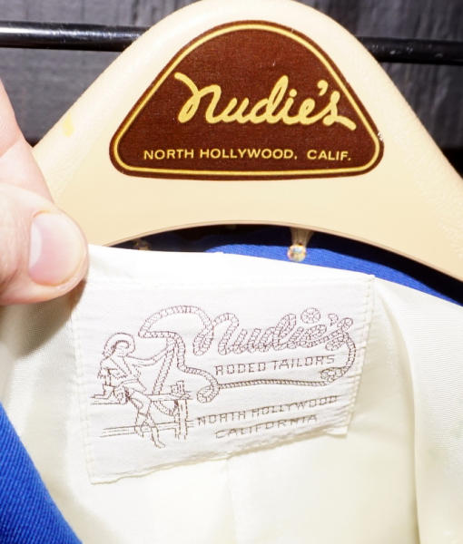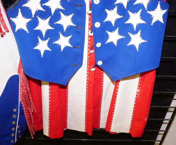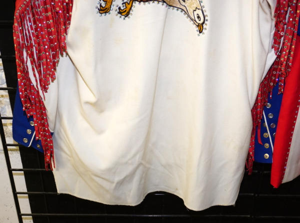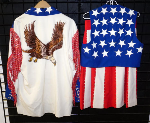 Wow, what a find! Lyle & Helen had these made to go to Roy Rogers festivals and events across the country, both were made by the famous Nudie's Company that made outfits for all kinds of music stars, really high quality with rhinestone studs, leather, and heavy material, few light age spots, but overall both are excellent condition, no size listed, but I would say both are small size (Lyle and Helen are not very big people, and they were the same size as Roy & Dale!), sells as a set for one money