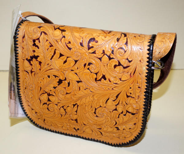 beautiful custom, hand-tooled leather purse with a dog design, about 13" wide, 11" tall, near mint condition, this was custom made for Helen Dumont, the dog's name tag has "City of Sigourney, IA"