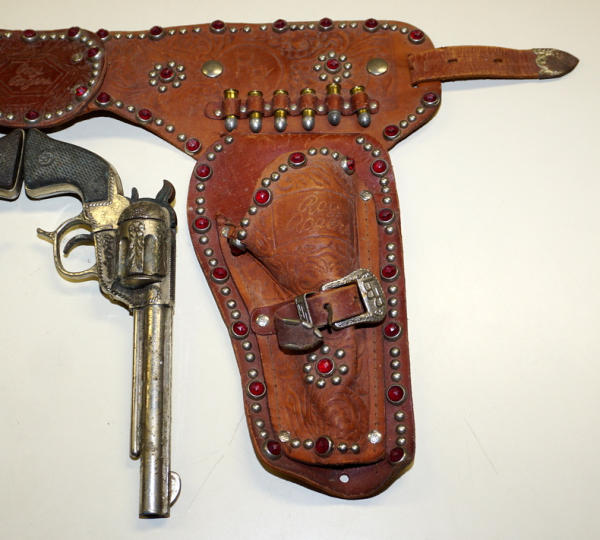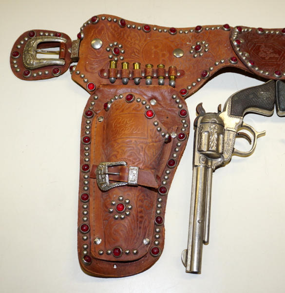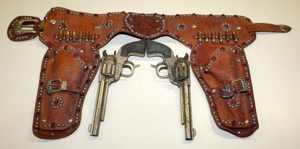10" guns, one gun works, one does not and has some corrosion, very fancy holster is nice with some normal wear, sells as a set