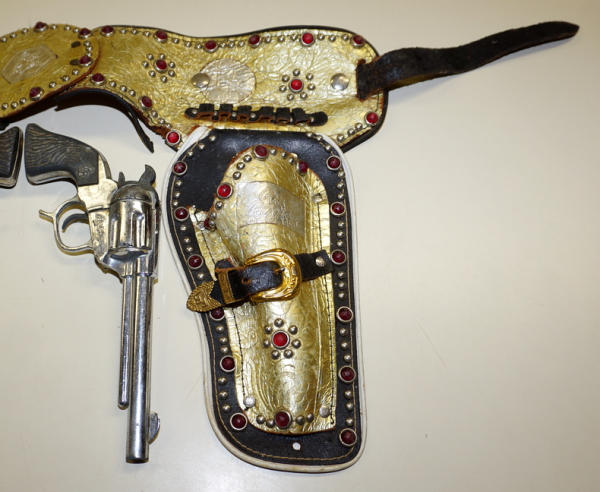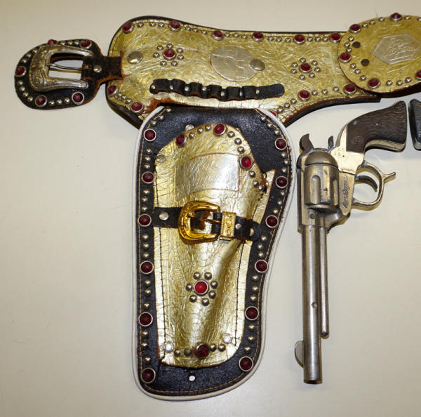 one cap gun works, one does not, same style holster as the previous lot but more of a "Deluxe" Version with the colored leather, some normal wear, but overall super sharp
