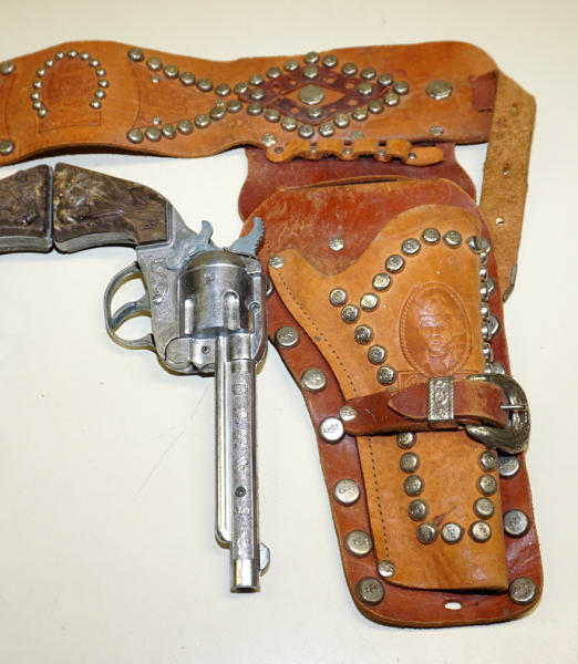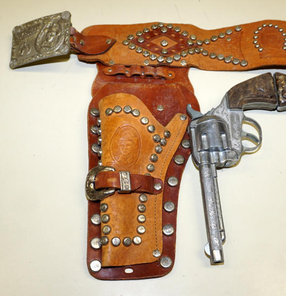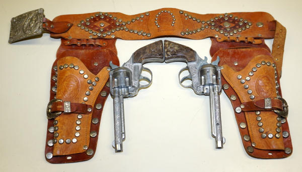 8.5" guns, both display fine, but not working, heavy studded holster is nice with large RR's Buckle, nice condition
