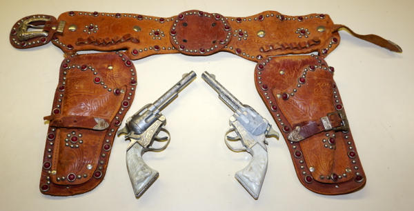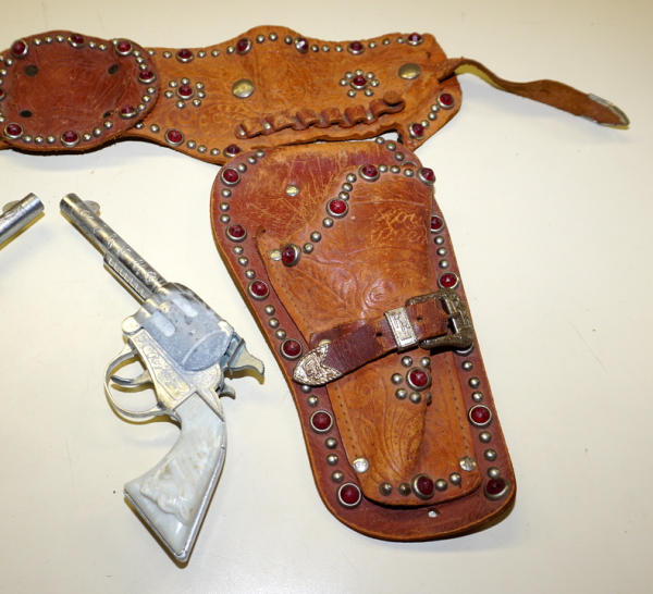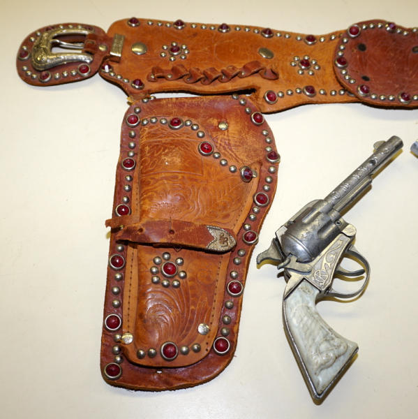 Leather holster has wear and one of the tabs holding the holster to the belt is torn, 8" guns match and both work, one has some corrosion,