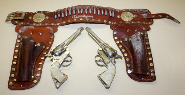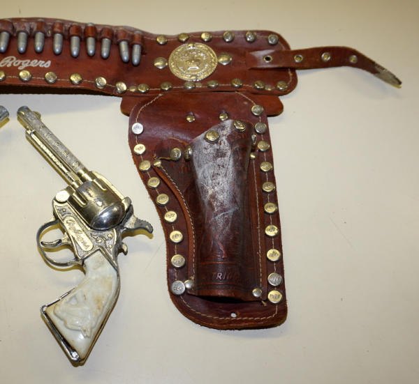 matching 9" guns work, but both have quite a bit of paly wear, heavy leather holster with plastic bullets and heavy metal tacks & decoration, has some general wear