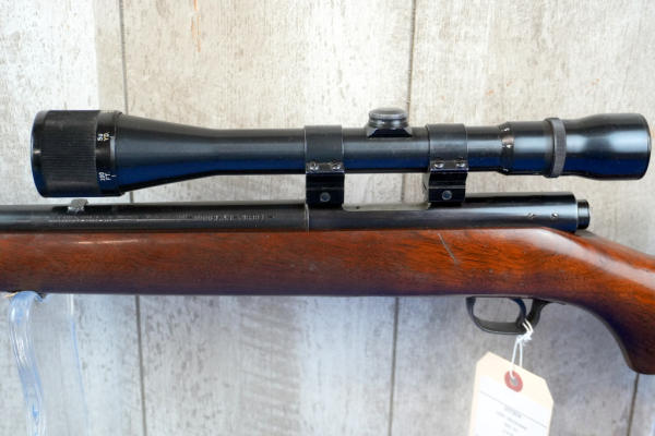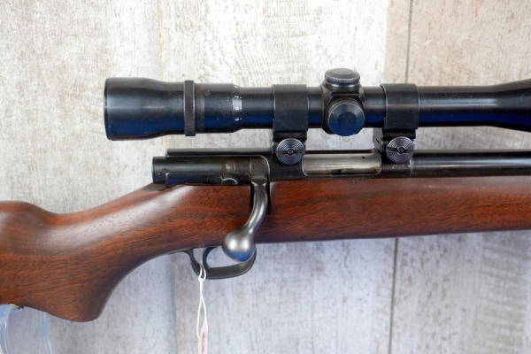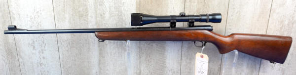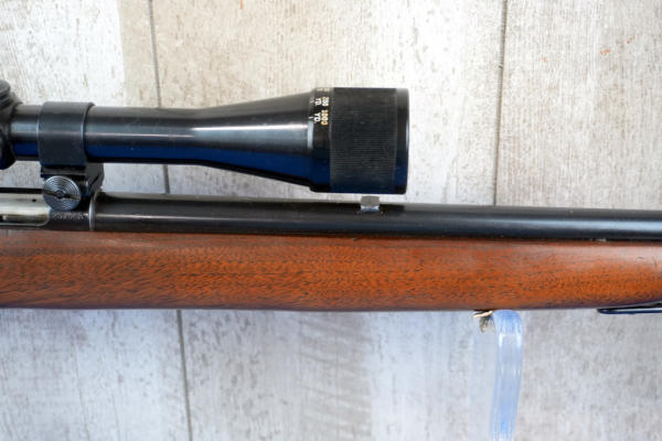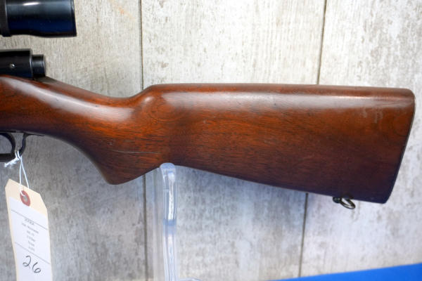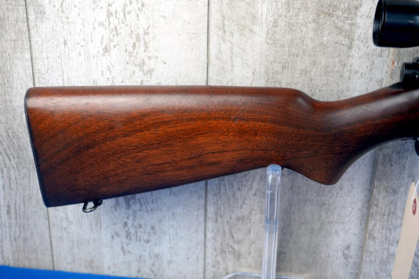 24" BBL w/hooded front sight; nice wood stock; smooth action; removable magazine; Weaver V9 scope; hard gun to find; USA; SN#25790A
