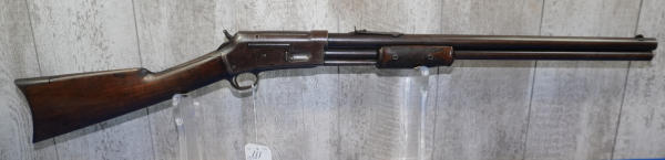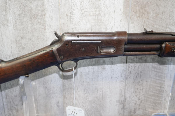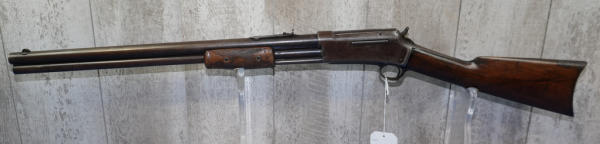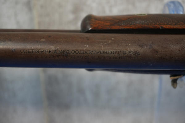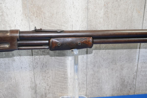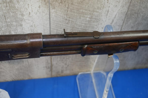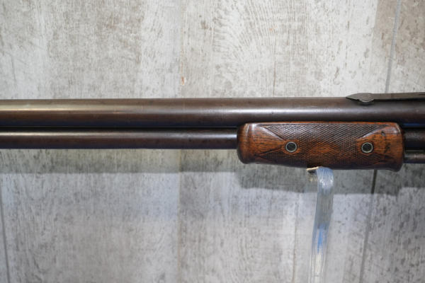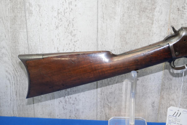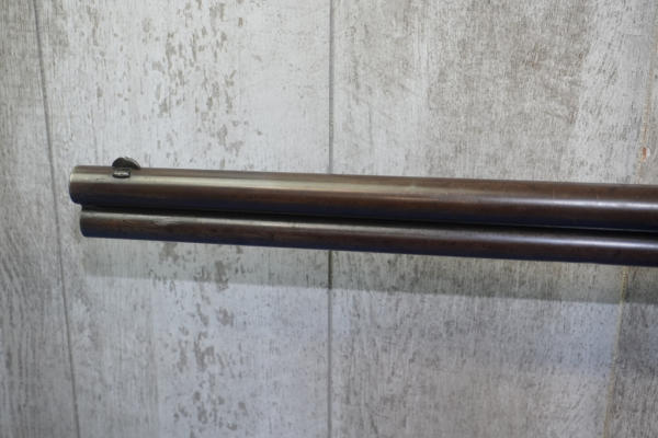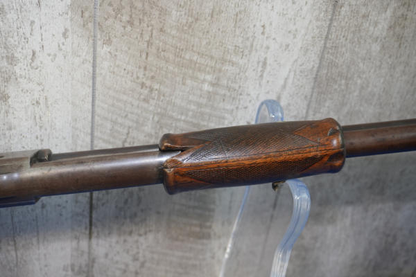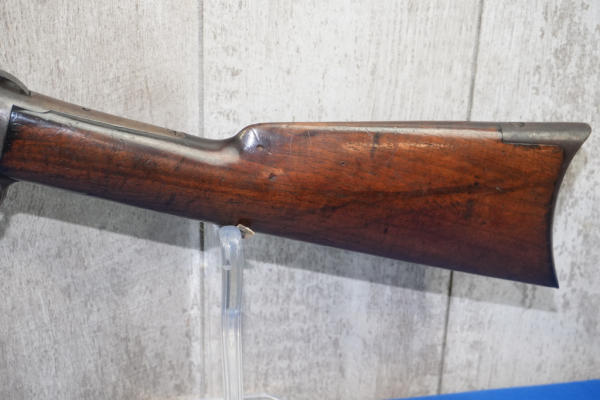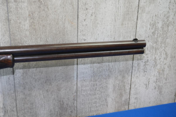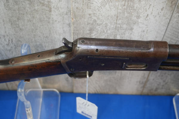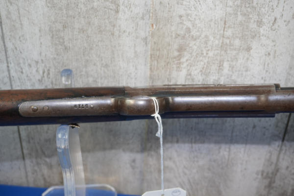 Mfg.1887-94 and approx. 1,800 mfg. in this caliber; smooth action; 22" heavy Rnd. BBL; full length receiver tube; wood English stock w/metal crescent butt plate; forearm has some damage; bluing is thin and brown patina; No Transfer needed; USA; SN#5719