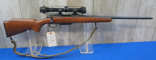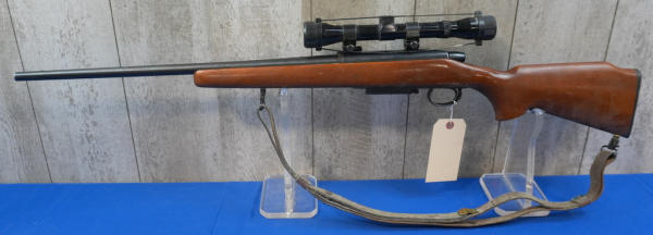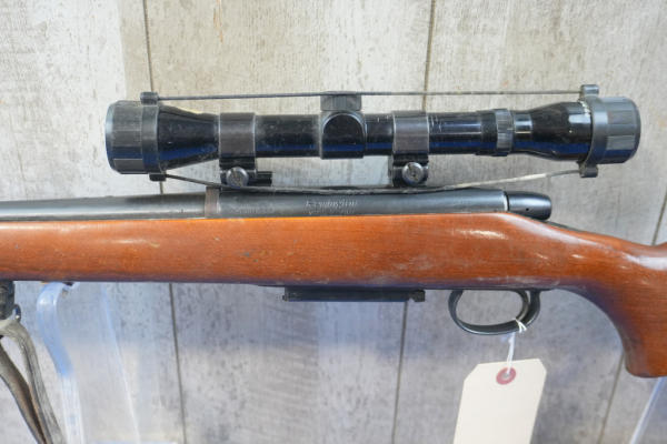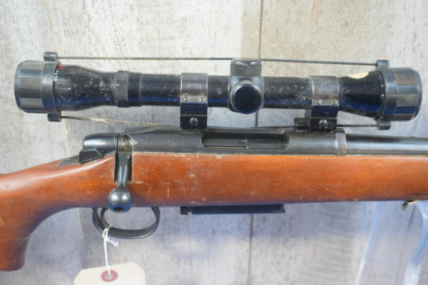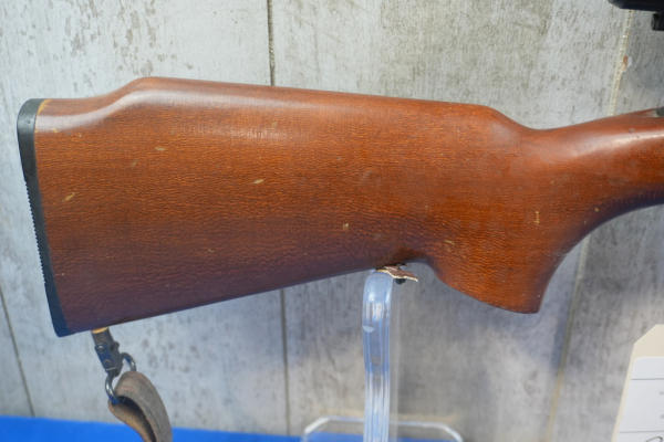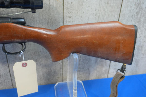 22" BBL; smooth action; leather sling has mold residue; water spotting on wood stock; removable magazine; Tasco 4x32 scope; needs a good cleaning; USA; SN#A6061528